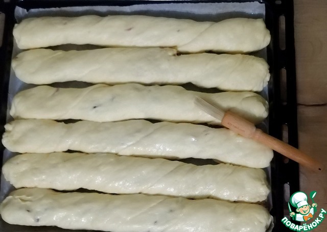 Оба края рулета прокрутить в противоположные стороны, слегка вытягивая по размеру противня.