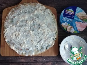 Даём блинам остыть немного и делаем намазку сырно-майонезную. Плавленный сырок в треугольниках Hochland очень легко соединился с майонезом при помощи вилки. На один блин идёт 1 ст л майонеза и 1 плавленный сырок в треугольниках Hochland с грибным вкусом.