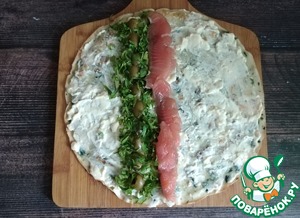 Теперь раскладываем начинку. Оливки я порезала пополам вдоль, петрушку мелко порубила. Рыбу нарезала длинными тонкими слайсами шириной ~2 см. Разложила по блину (см. фото).