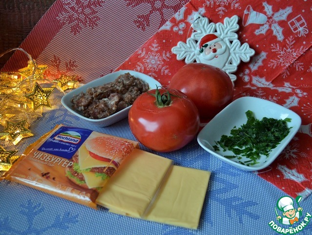 Две пластинки плавленого сыра разложить на доске, на них нанести фарш. Я использую плавленый сыр Чизбургер от ТМ Hochland.