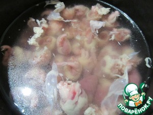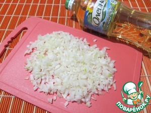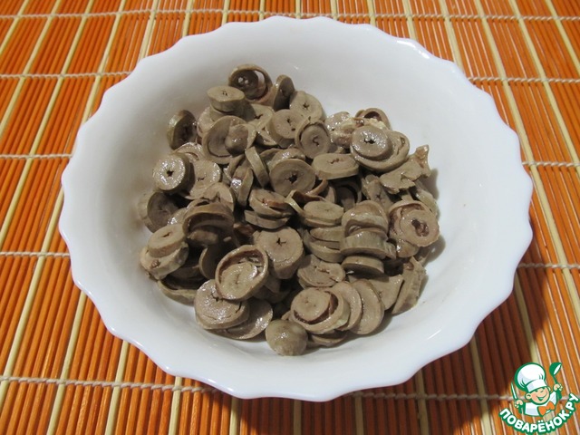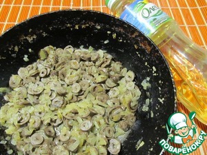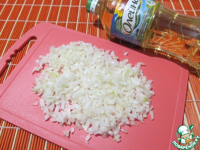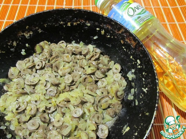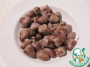 На сковороду налить 1ст. л растительного масла (я использую масло ТМ Олейна). Выложить лук и пассеровать до мягкости. Добавить сердечки и обжарить вместе с луком минут 5.
