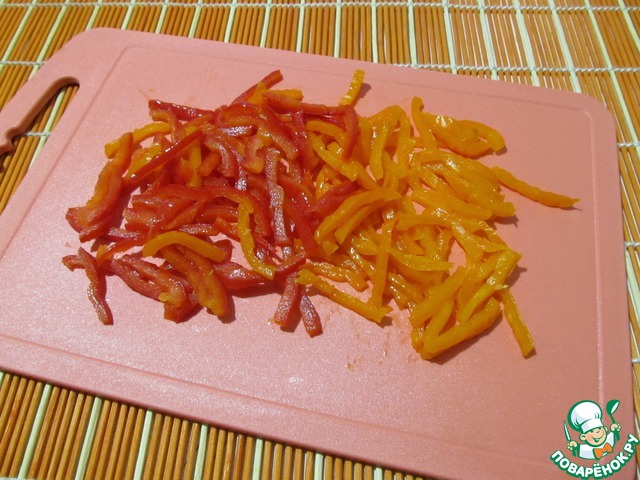 Сладкий перец нарезать соломкой. Я взяла половинку красного и половинку оранжевого перца.