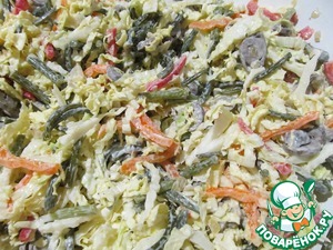 Пекинскую капусту нарезать соломкой и смешать со всеми подготовленными продуктами.