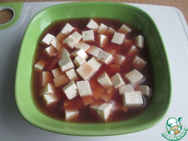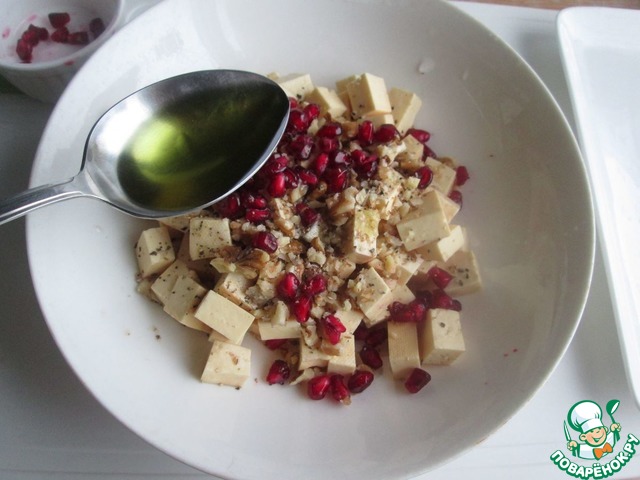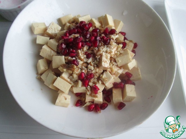 Брынзу нарезать кубиками и залить смесью воды с гранатовым соком. Оставить на 15 минут. Затем жидкость слить.