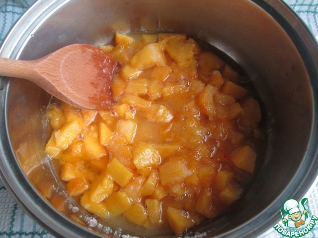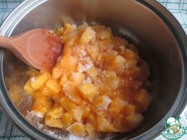 Хурму очистить, нарезать на кусочки, засыпать сахаром и перемешать. Оставить на некоторое время для выделения сока.