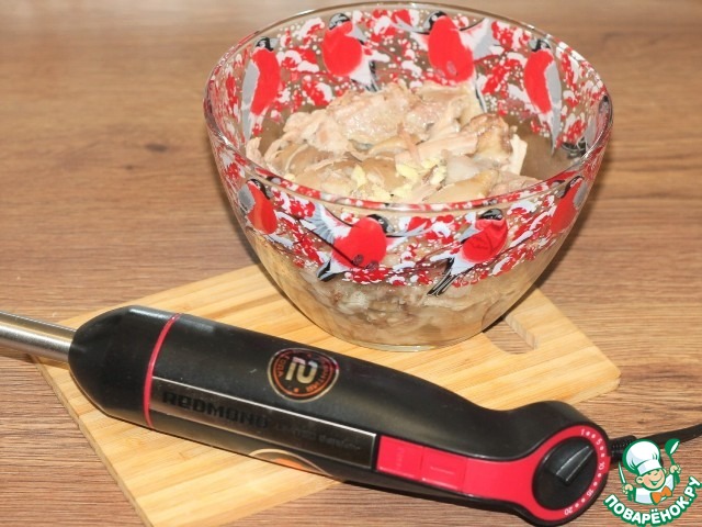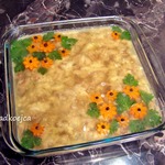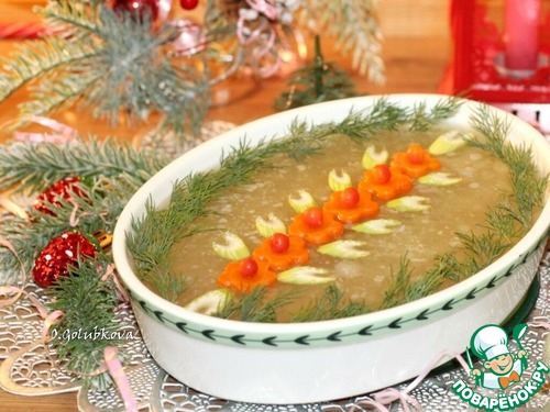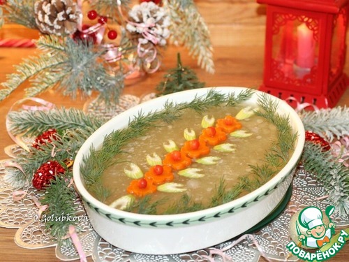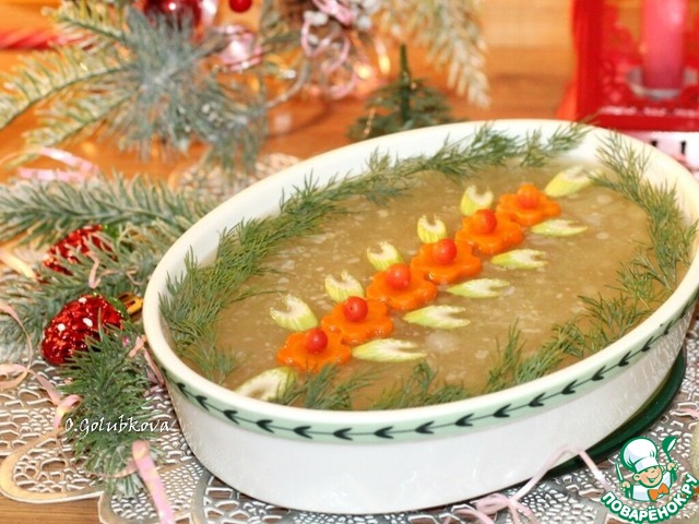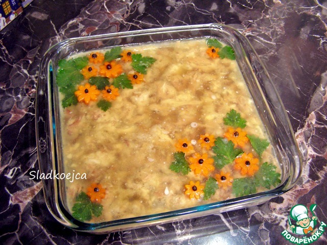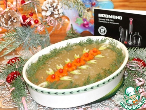 Я блендер применила, почему? Конкурс с техникой. Потом запарка перед Новым Годом. Не надо лишний раз копаться руками. Время на обработку сократилось. И было интересно, что получится. Мне хотелось, чтобы верхний слой был более прозрачным. Чтобы залитые бульоном цветы были хорошо видны и при перевозке на машине, верх холодца остался в целости.