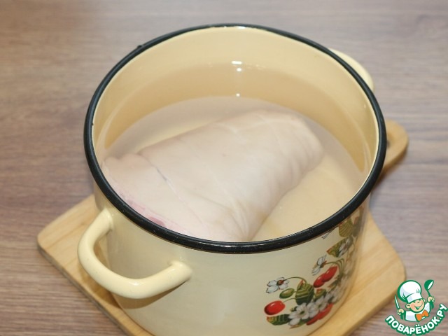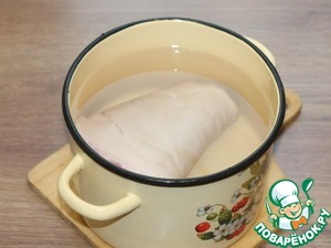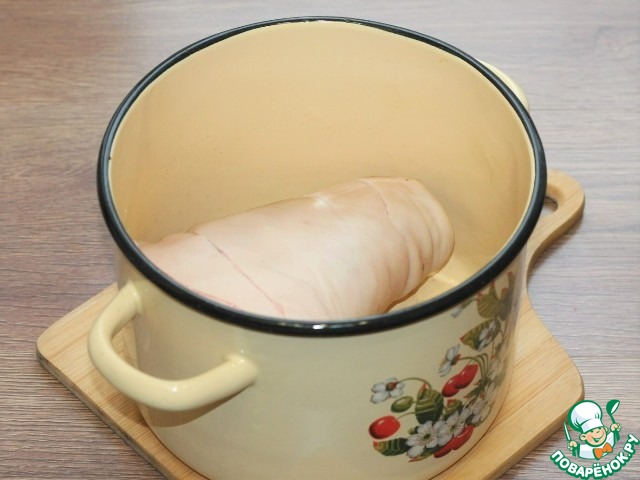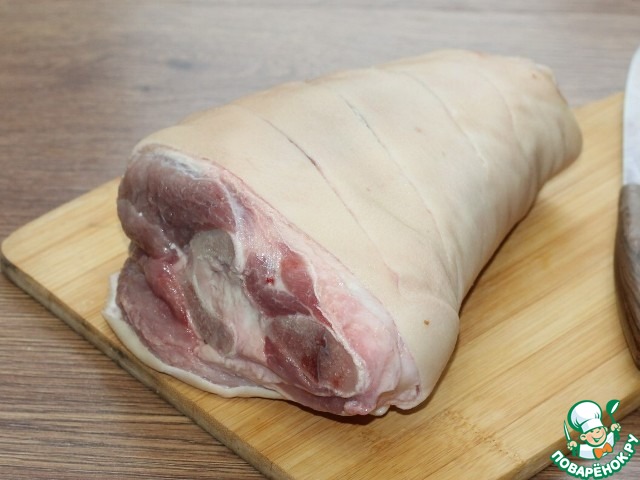1. За 3 часа до приготовления холодца, рульку, я положила в воду и периодически меняла. Шкурку свиной рульки очистила ножиком (поскребла) и хорошо промыла. На шкурке рульки с двух сторон, сделала надрезы.