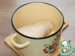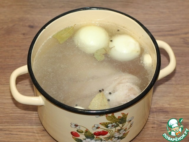 5. Затем морковь извлекаю и продолжаю варить до готовности рульки, приблизительно 2 часа. Отрезаем кусочек мяса и пробуем. Готовую рульку достаю из бульона и охлаждаю.