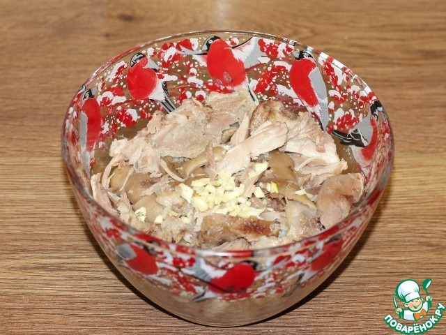 7. Отделяю мясо и шкурку от косточки и удаляю жир. Отобранную мясную смесь выкладываю в большую миску и добавляю порубленный чеснок (1 зуб) и по вкусу смесь перцев.
