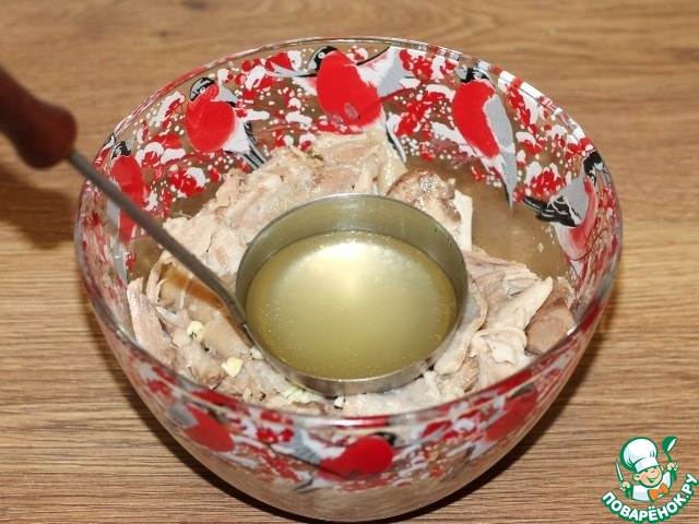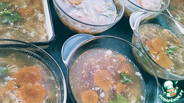 10. Разложила мясную смесь по формочкам и охладила на балконе (t —5), приблизительно 1 час. Затем за 2 приема разливала бульон по формочкам и каждый слой охлаждала. 150 мл бульона, я оставила для украшения холодца.