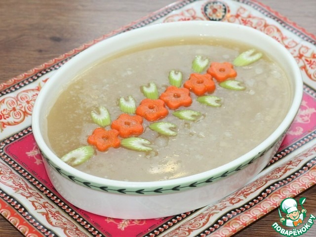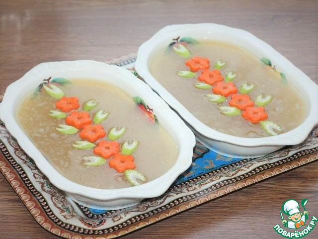 Уже застывший холодец, я украсила морковью и сельдереем. Аккуратно залила бульоном (150 мл) верхний слой холодца и декора из овощей. Охлаждала до готовности. Для создания аккуратных слоев понадобится время, но такое угощение не оставит ваших гостей равнодушными.