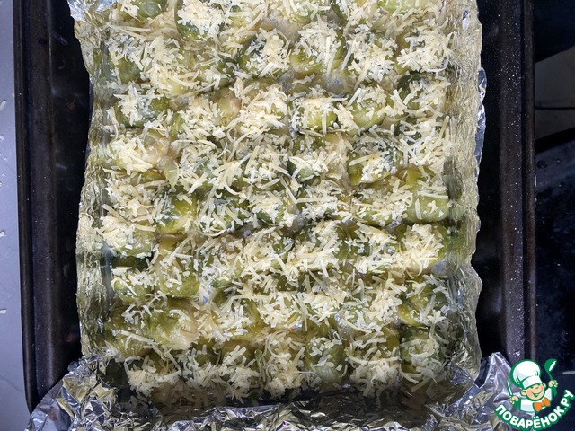 Выложить натертый сыр на тарелку. Обмакнуть половинки брюссельской капусты в сыр и положить разрезанной стороной вниз на противень, сбрызнутый оливковым маслом. Обильно посыпать солью, перцем и еще оливковым маслом.