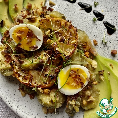 Смешать брюссельскую капусту с несколькими столовыми ложками заправки и разложите на блюде. Добавить нарезанный авокадо, разрезанные пополам перепелиные яйца, поджаренные грецкие орехи и обжаренные ломтики лимона. Подавать теплым.
