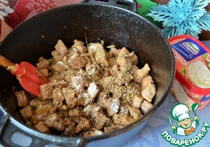 Посыпать мукой и сушёными грибами. Обжарить пару минут, огонь средний.