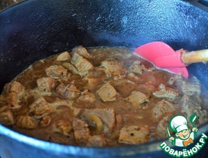 Влить кипяток, томить до готовности мяса, от 40 до 70 минут. Огонь минимальный. Слегка посолить.