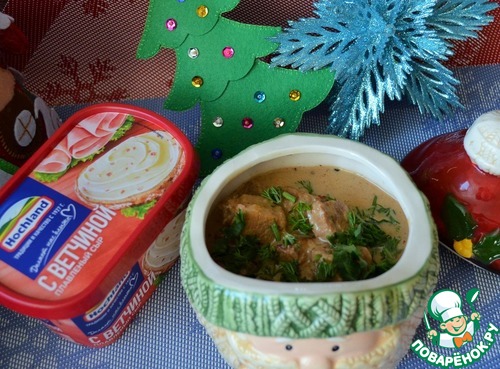 Добавить сыр и чёрный молотый перец, перемешать, дать закипеть и убрать с огня. Я использую плавленый сыр с ветчиной от ТМ Hochland.
