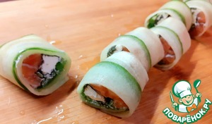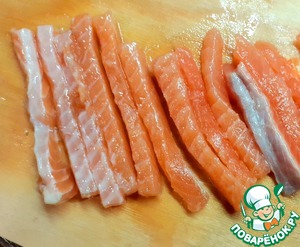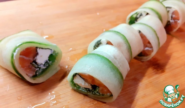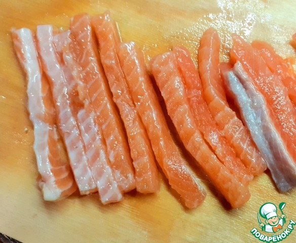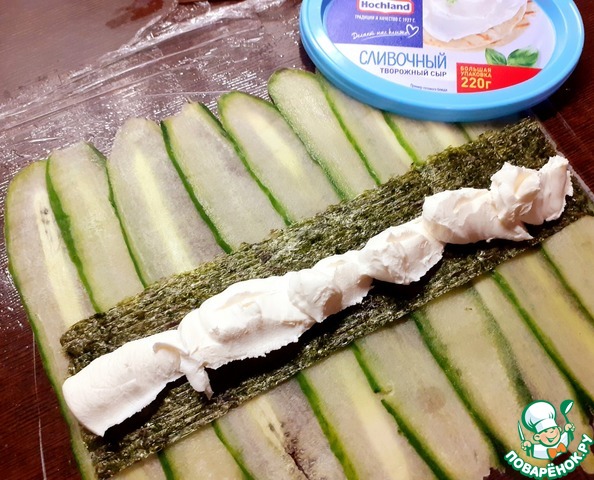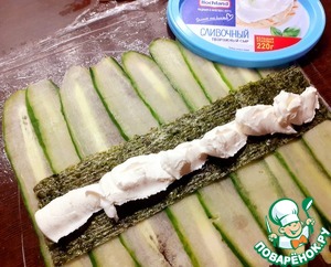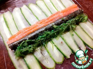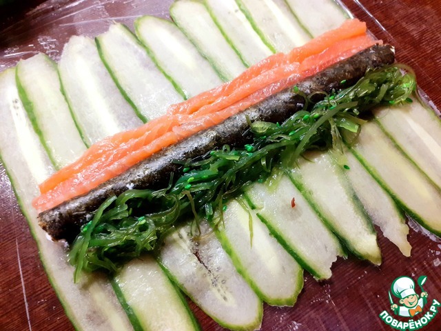 С одной стороны от нори с сыром выложить лосось, а с другой - водоросли чука