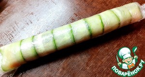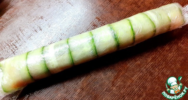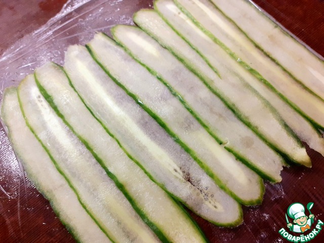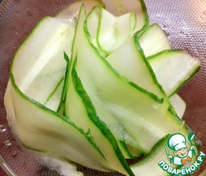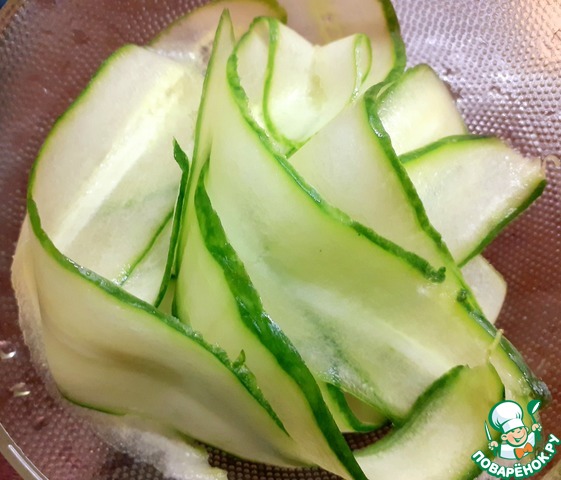 Огурец нарезать тонкими пластинками, используя овощечистку