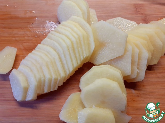 Картофель помыть, почистить и нарезать на тонкие пластинки