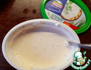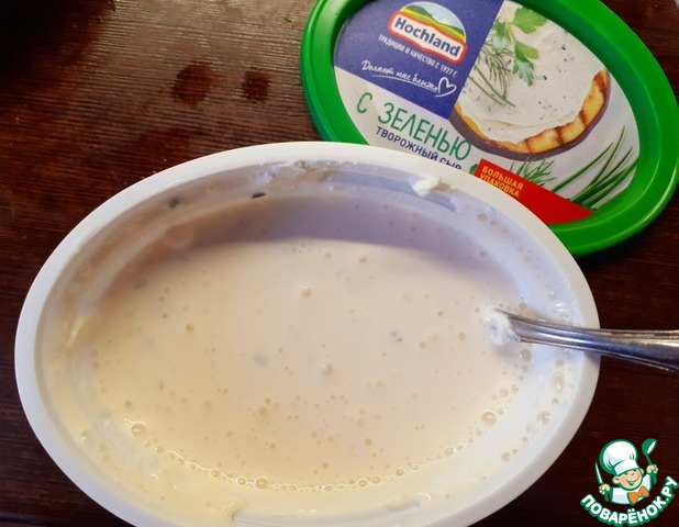 Смешать творожный сыр Hochland с молоком. тщательно перемешать