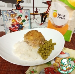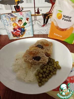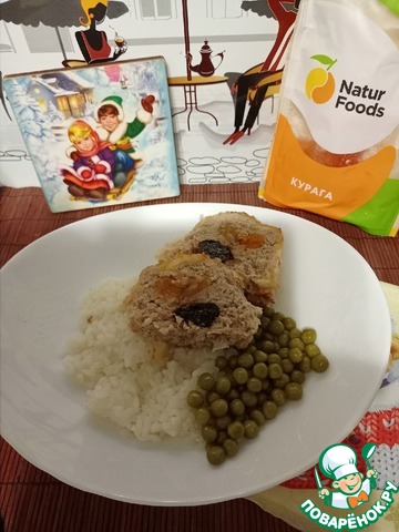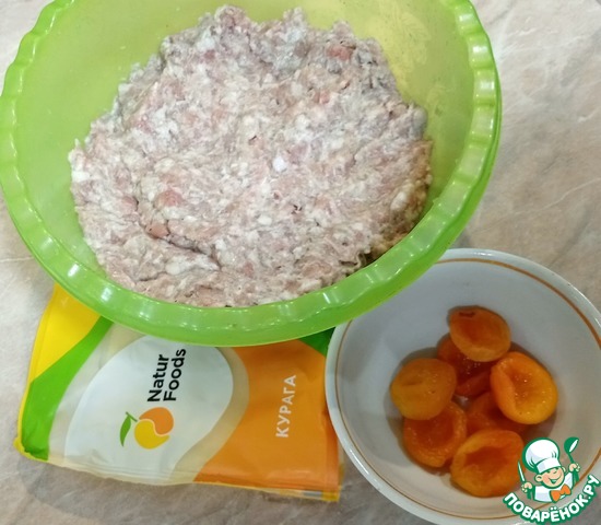 Добавить к фаршу натертый на мелкой терке репчатый лук, продавленный чеснок, яйцо, соль и перец по вкусу и хорошо всё вымесить. В кураге сделать надрез ножом и вставить по четвертинке ореха в курагу и тоже самое проделать с черносливом. В широкий пластиковый стаканчик, смазать в середине его предварительно маслом растительным, накладываем немного фарша в верхушку, вложить курагу с орехом. Закрыть фаршем и затем положить чернослив с орехом, в процессе всё уплотняем, чтобы не было пустот. Закрыть все фаршем, немного встряхнуть и снять стаканчик со стожка.