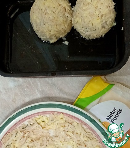 Натереть на крупной тёрке картофель и сыр и смешать их. Каждый стожок обвалять в картофельно-сырной массе и придавить её немного к мясу. Поставить стожки в противень, смазанный растительным маслом.