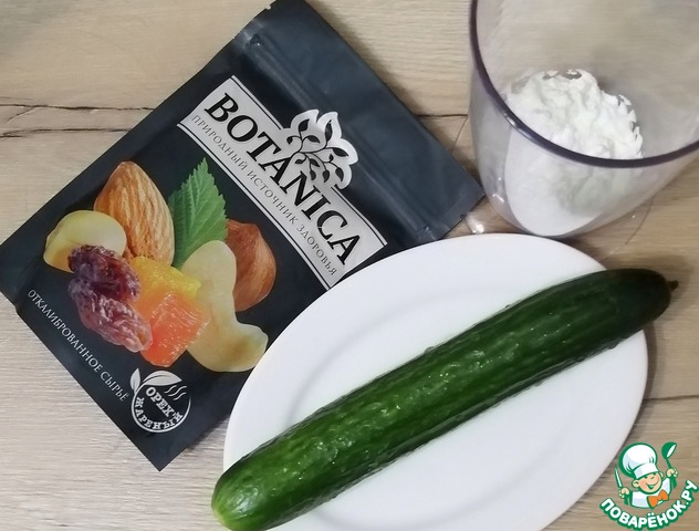Огурцы моем, режем на кусочки, Выкладываем в стакан с кефиром. Туда же добавить изюм, цукаты, орехи.
