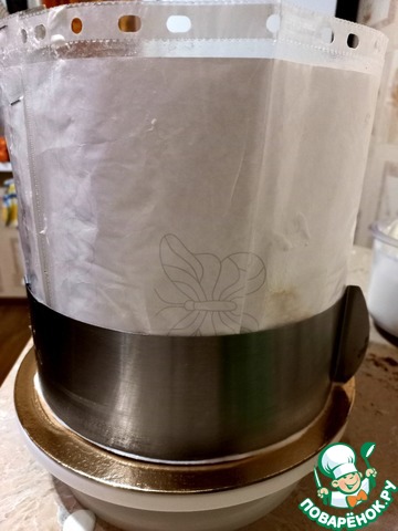 Первым выкладываем белый бисквит пропитанной стороной вниз. Устанавливаем кольцо. Как правило торт получается намного выше кольца и необходима ацетатная плёнка для того, чтобы увеличить высоту стенок кольца. Не всегда она бывает под рукой. И вот я поделюсь с Вами 1 хитростью: в обычные канцелярские файлы вставляю бумагу и скрепляю между собой степлером. И вставляю в кольцо. Получается не хуже, чем ацетатная плёнка.