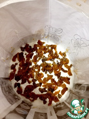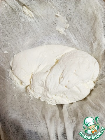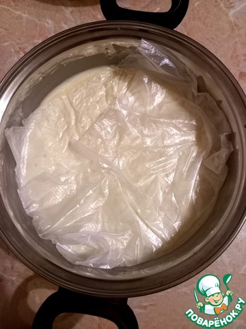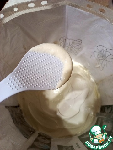Я же решила выровнять крем-чизом бока торта. Только вот в предновогодней суете ни в одном магазине не было нужного мне творожного сыра. Я не расстроилась и решила сделать творожный сыр из кефира. Конечно это не совсем творожный сыр, но за неимением лучшего я все-таки решилась на эксперимент. И вот вам 3 секретик: если у Вас нет творожного сыра, а он Вам очень нужен не расстраивайтесь, главное, чтобы кефир был. Итак 2 пакета кефира пл 900 мл заморозить на ночь. Затем дуршлаг, выстланный марлей в 2 слоя, поместить на миску, чтобы под низом было место для сбора сыворотки. Замороженный кефир освободить от полиэтилена и оставить до полного размораживания. Сыворотку необходимо периодически сливать. Мешать и разбивать сгусток нельзя. В итоге у меня получилось около 530 гр "творожного сыра".