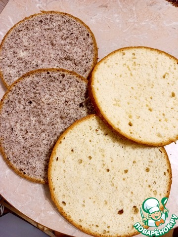 Таким же образом испечь второй обычный бисквит. Яйца взбить с сахаром до побеления и увеличения в объёме в несколько раз. Муку смешать с разрыхлителем. Аккуратно просеять муку в яичную массу и аккуратно перемешивать складывающими движениями венчиком. Форму смазать сливочным маслом и обсыпать мукой. Вылить тесто в форму и выпекать в заранее разогретой до 180 °С духовку минут 35-40.