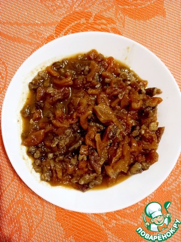 Для начинки курагу на 10 мин залить холодной водой. Обсушить и нарезать крупными кусочками. Грецкие орехи слегка подсушить и также нарубить крупными кусочками. Из крупного апельсина выжать сок. У меня получилось где-то 150 мл сока. В кастрюле с толстым дном смешать курагу с орехами, добавить апельсиновый сок и сахар. Все хорошо перемешать. Добавить немного воды, чтобы слегка покрывала сухофрукты сверху. Варить на небольшом огне до выпаривания жидкости около 25 мин. Вот такая вкусная и ароматная начинка получается. Остудить.