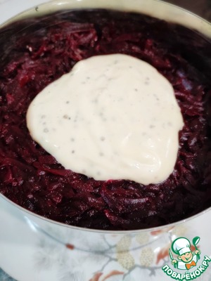 Соберите салат. Я собирала в кольце (d-16). Подберите подходящее блюдо с ровным дном. Поставьте кольцо. Первый слой - картофель. Разровняйте картофель по диаметру кольца. Выложите на него 2 ст. л. соуса. Распределите его по всей поверхности картофеля.