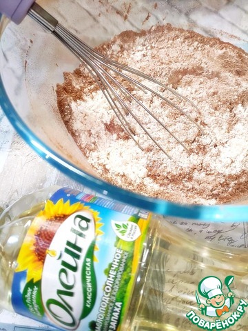 Приготовьте шоколадное тесто. Муку, какао-порошок и разрыхлитель просейте через сито. Перемешайте венчиком.