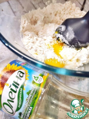 Приготовьте творожную массу. В отдельной миске соедините яйцо, творог, сахар. Добавьте муку, ванилин и разрыхлитель. Всё пробейте погружным блендером до однородности.