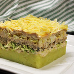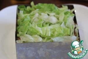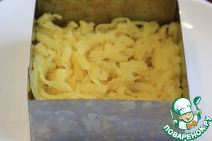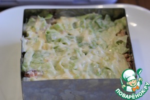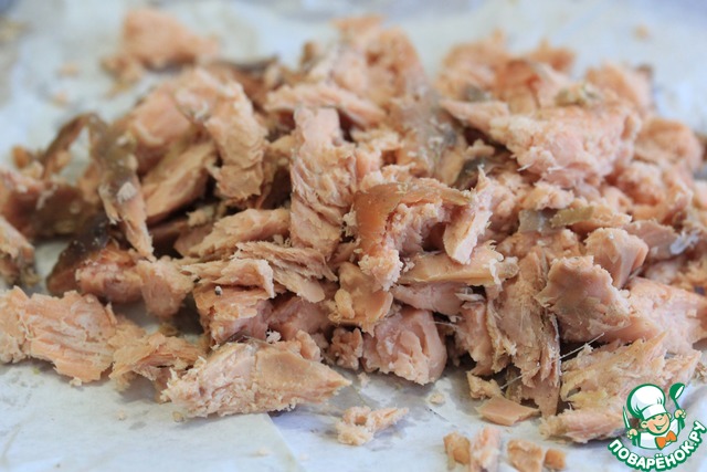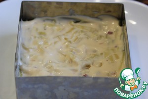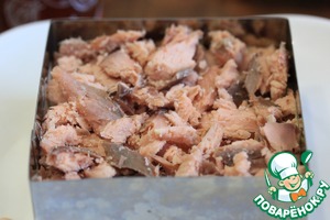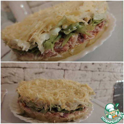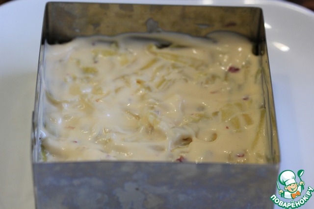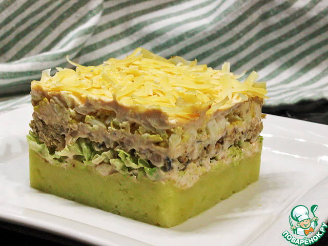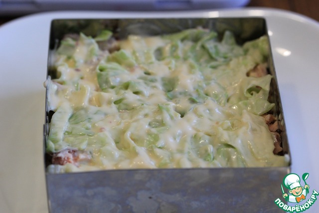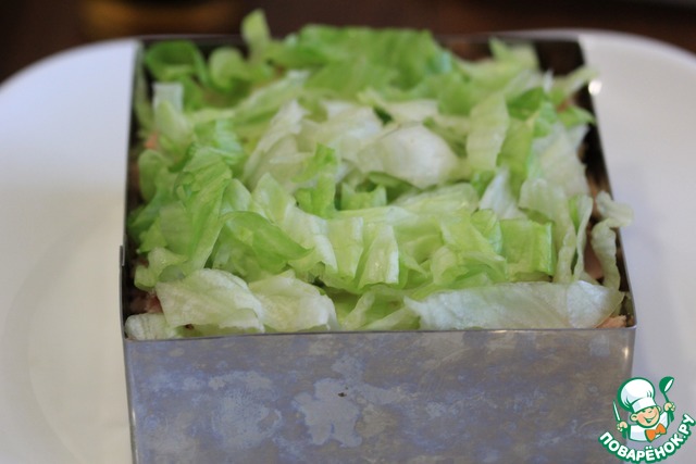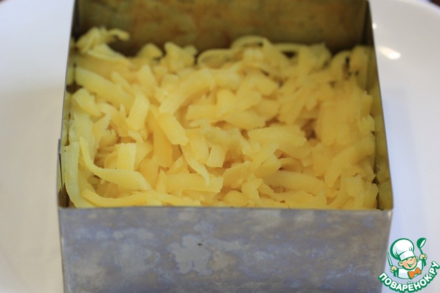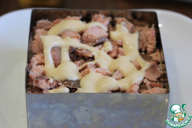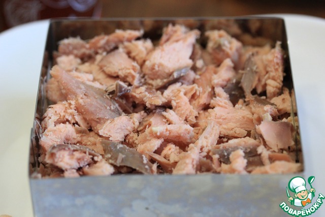 1) Количество ингредиентов я даю в той раскладке, что готовила сама, в оригинале они такие: картофель 300 г, горбуша 300 г, айсберг 200 г, яйцо 5 шт., сыр 200 г, майонез 200 г, сладкий чили 120 г. Это количество продуктов рассчитано на разъемную форму диаметром 20 см.