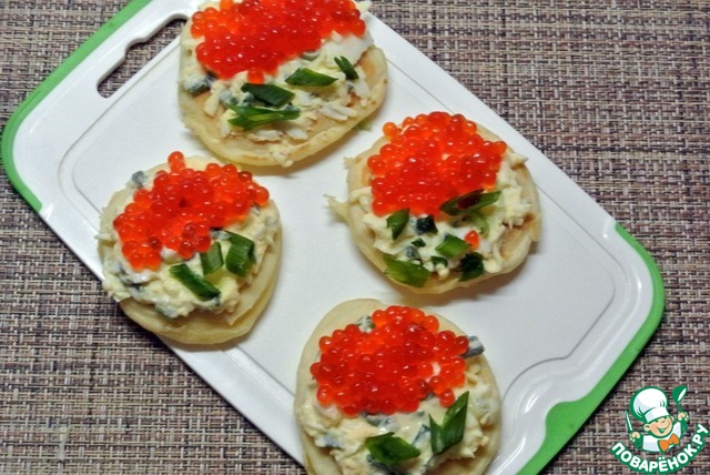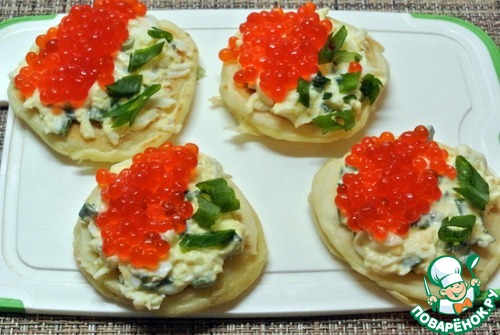 Выложить начинку на мини-блинчики. Украсить красной икрой. Посыпать оставшимся зеленым луком. Можно выложить на листья салата.