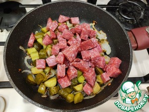 Далее добавить нарезанную кубиками подкопченную колбасу и соленые огурчики и пряности. Обжарить все на среднем огне до легкой золотистой корочки. Затем смесь переложить в миску.