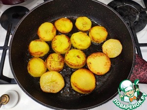 Картофель отварить в мундире, остудить, почистить, нарезать пластиками по 0,8-1 см.