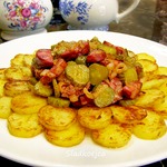Блюдо немецкое, но с русским акцентом, я бы сказала. В оригинале, по рецепту, в нем нет соленых огурчиков, но, на мой взгляд, именно они придают особую пикантность блюду. Блюдо из разряда простых и по-домашнему вкусных. Даже если после встречи Нового года в холодильнике остался минимум продуктов, блюдо можно приготовить из того, что есть. Картофель, соленые огурчики, лучок, пряные травки-муравки и небольшой кусочек копченого мяса или подкопченных колбасок, вот и весь набор ингредиентов.