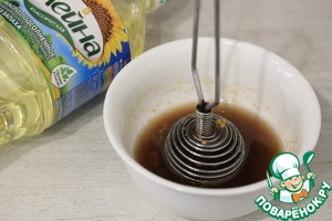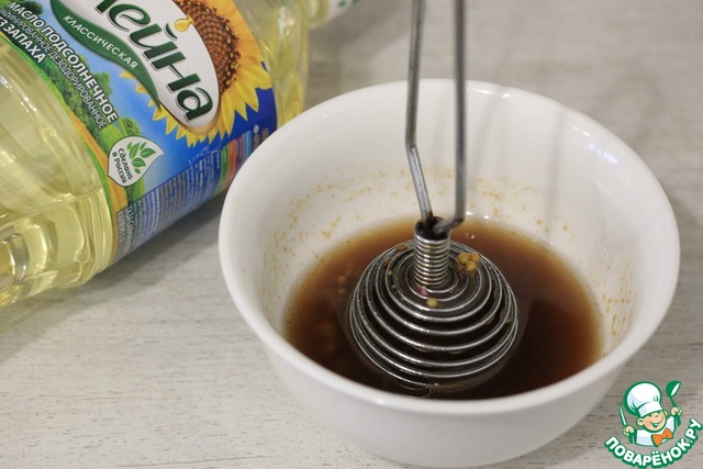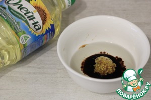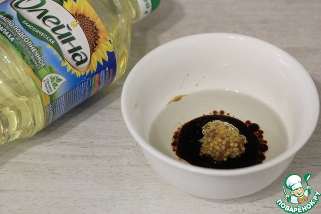 Для заправки соединить растительное масло (у меня Олейна классическая) с соевым соусом и горчицей.