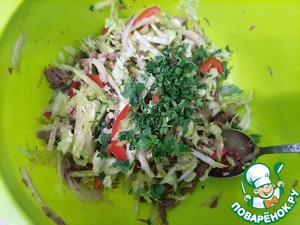 Заправить салат, перемешать и попробовать. При желании добавить немного лимонного сока.