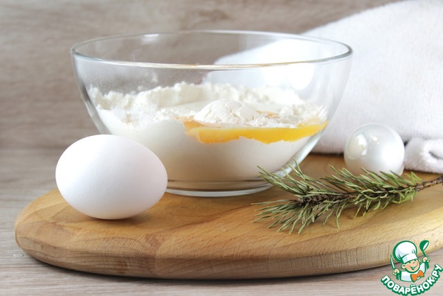 В чашку просеять муку, добавить соль и разрыхлитель, перемешать.