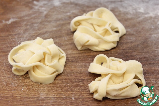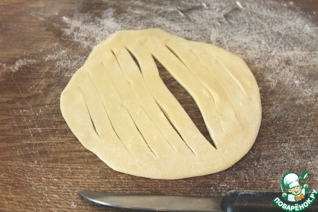 Каждую часть теста раскатать в пласт толщиной 1-2 мм. Пласт теста, отступая от краев 5 мм, нарезаем полосками шириной около 5-6 мм.