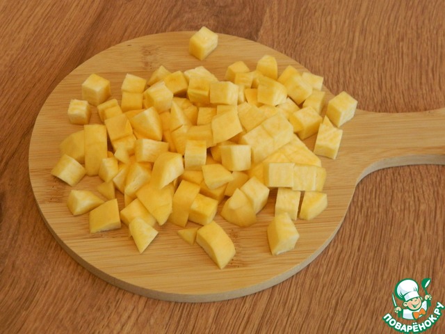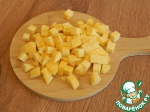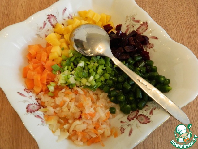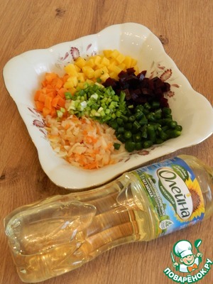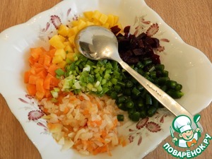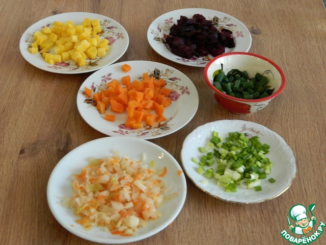 Отваренные морковь и свеклу нарежем кубиками. Квашеную капусту и спаржевую фасоль нарежем помельче.