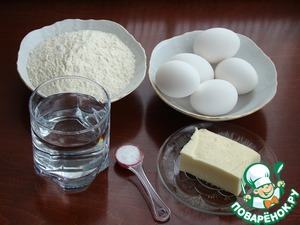 В первую очередь приготовим профитроли. Для этого нам понадобятся: мука, вода, яйца и сливочное масло со щепоткой соли.