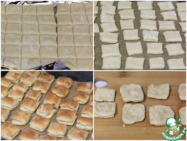 Лист слоеного теста разрезать на небольшие квадратики, выложить на противень и запекать примерно 15 минут при 180°С.