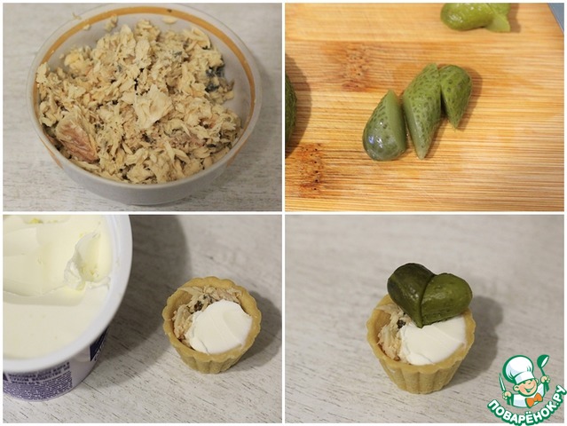 В тарталетки выложить горбушу, затем добавить творожный сыр.