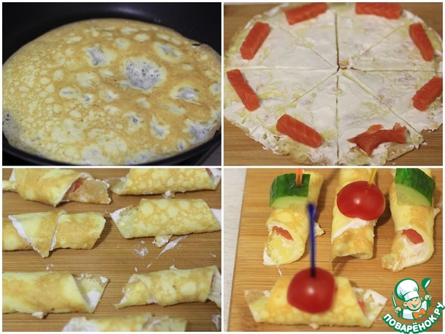 Яйцо взбить вилкой и выпечь яичный блин. Остудить его и разрезать на 8 частей.