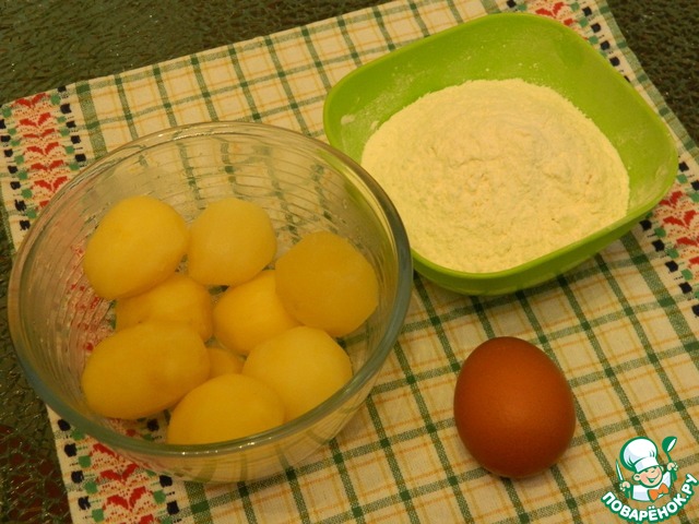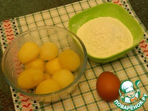 Отварить картофель, у меня мелкая картошка, поэтому ее побольше. Для теста еще нужна мука и яйцо.