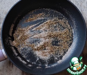 На сковороде раскалить соль и специи (орегано, базилик, сухая аджика).